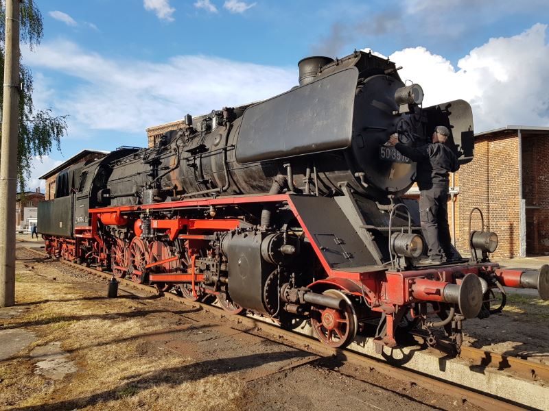 Erfreulich war auch, dass unsere 50 3570 nach erfolgter Hauptuntersuchung wieder unter Dampf stand und diverse Führerstandsmitfahrten absolvieren konnte. Leider ist der Original-Tender noch nicht fertig gestellt, so dass die Lok vorübergehend mit dem betriebsfähigen Tender der Dampflok 50 3682 gekuppelt wurde. Das hat nach einigen Anpassungsarbeiten am Übergang zwischen Lok und Tender nicht nur gut funktioniert. Der neue Anblick hat wohl auch die Eisenbahnfotografen gefreut, für die wir am späten Samstagnachmittag im besten Abendlicht einige Motive arrangieren konnten. Die folgenden Fotos entstanden in diesem Rahmen.