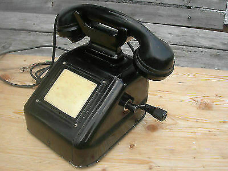 Dominierend dabei ist der Telefonapparat an der Rückwand der Bude. Dabei handelte es sich in der Regel um ein Gerät, das mit einer Handkurbel ausgestattet war. Durch Drehen dieser Kurbel wurde in dem Gerät ein elektrischer Induktor betätigt, der einen geringen Strom auf die Telefonleitung schickte. Dieser Strom erregte in den angeschlossenen anderen Sprechstellen die Telefonklingeln. Das folgende Bild zeigt ein solches Telefon. Es wurde auf der Internetseite https://www.motor-talk.de/bilder/toms-diskusions-ecke-g79846963/kapsch-kurbeltelefon-streckenfernsprecher-telephon-telefon-bahn-db-post-i209331312.html veröffentlicht.