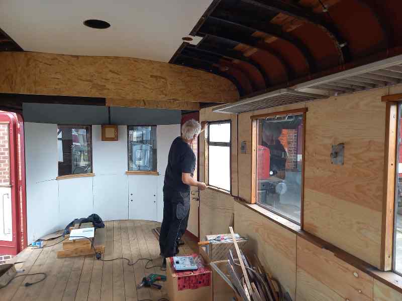 Deutlich ruhiger, aber trotzdem emsig wurde in dem Beiwagen 197 805 gearbeitet. Hier ging der Innenausbau an den Wänden weiter.