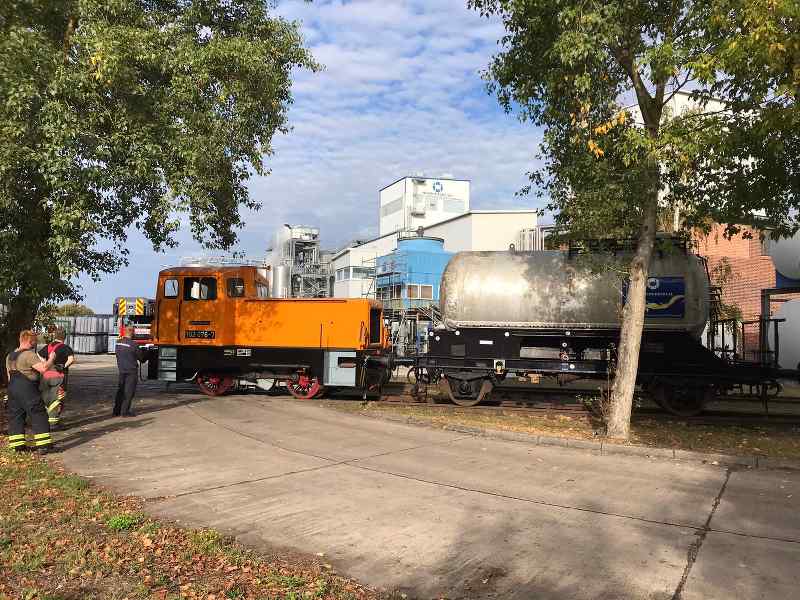 Einen kleinen Ausflug durfte unsere Diesellok 102 076 in den Hafen machen. Dort holte sie einen Güterwagen von der Firma IOI ab, den diese der Gefahrstoffeinheit des Landkreises Prignitz als Übungsobjekt zur Verfügung gestellt hatte. Der Wagen wurde im Hafen aufgestellt.