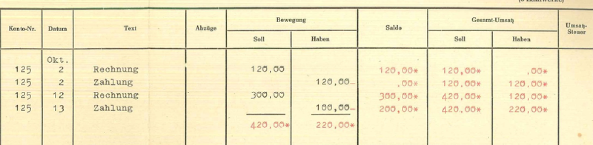 Grundsätzlich arbeitete diese Maschine als Tabellenkalkulator, machte also das gleiche wie heute Excel & Co. Man spannte ein großes, mit Linien vorgedrucktes Blatt ein. Anhand der Programmierung wusste die Maschine, wo die einzelnen Tabellenspalten liegen sollten und was dort zu tun war: In manche Spalten wurden per Tastatur Zahlen eingegeben, in anderen Spalten druckte die Maschine selbständig Rechenergebnisse an. Eine Tabelle könnte wie folgt ausgesehen haben (schwarze Zahlen waren einzutippen, die roten kamen automatisch):
