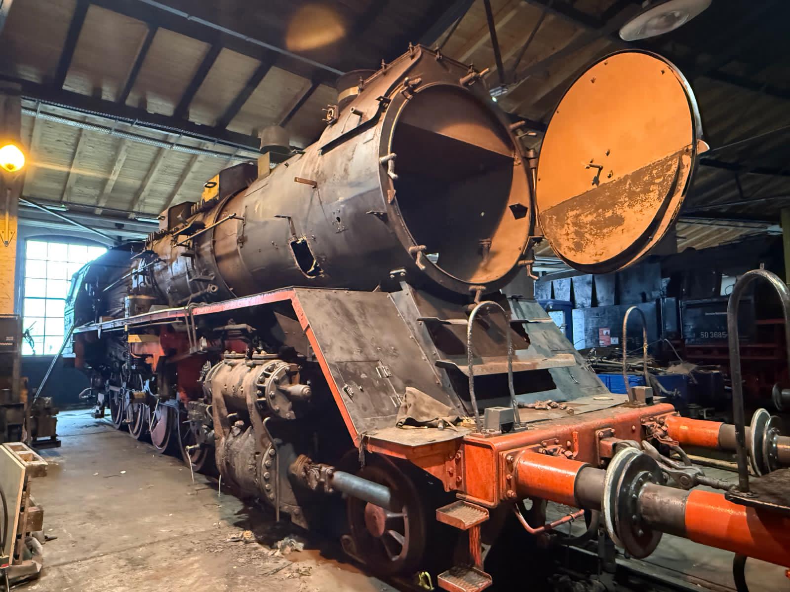 Arbeiten an unserer Dampflok 50 3682 am 3.4.2026. Das Führerhaus wird entfernt, um demnächst den Kessel der Lok abheben zu können.