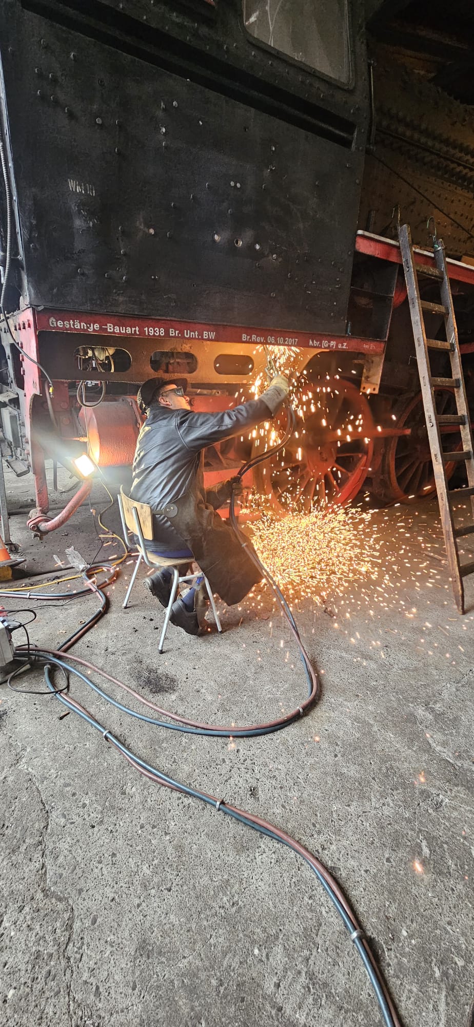 Bevor die Saison losgeht, haben wir ordentliche Fortschritte bei unserer Dampflok 50 3682 erzielt, die sich gerade in der Demontage befindet, damit sie einen neuen Kessel erhalten kann. Vorher muss allerdings noch das Führerhaus abgenommen werden, was gerade die Hauptaufgabe ist. Man glaubt gar nicht, wie viele Schrauben und Verbindungen zu lösen sind, damit das Führerhaus vom Rahmen und vom bisherigen Kessel getrennt werden kann. Etliche Schrauben waren dabei nicht mehr zu lösen. Also war der Schweißbrenner im Dauereinsatz, um sie durchzutrennen. Die angefügten Bilder zeigen den Einsatz der Kollegen.