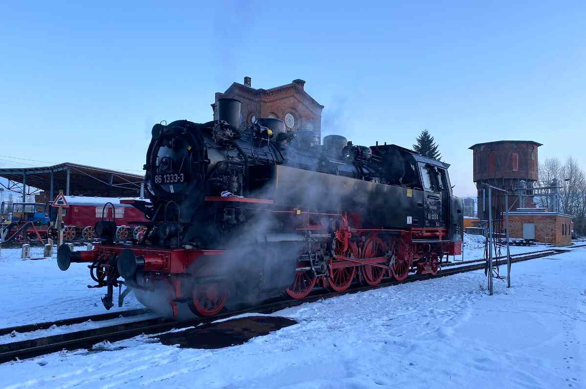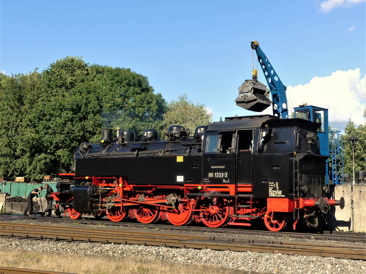 Dazu sind natürlich die etliche Vorbereitungen zu treffen, die uns schon seit einiger Zeit begleiten und immer intensiver werden, je näher wir dem Termin kommen. Was genau wird im Einsatz sein? Da wären zunächst einmal unsere beiden Dampfloks 50 3570 und Emma, die schon in den Startlöchern stehen. Unterstützt werden sie diesmal von der Dampflok 86 1333 der Pressnitztalbahn, die extra für unsere Veranstaltung ihre Heimreise von Hamburg bei uns unterbricht. Die Lokomotive wurde übrigens 1939 bei der Wiener Lokomotivfabrik Floridsdorf gebaut und wurde zunächst unweit von Wittenberge in Waren, Wittstock, Parchim und Güstrow eingesetzt. Quasi also ein Heimspiel.