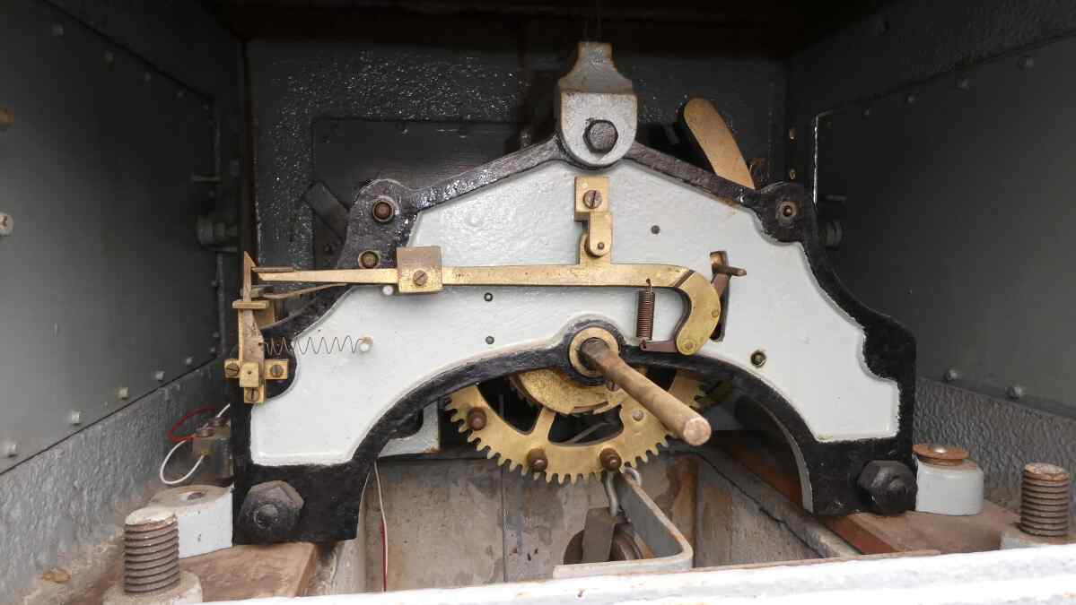 In diesen Betriebsstellen und in besagtem Büro befanden sich nun Läutewerke in unterschiedlichen Größen, die von dem Strom ausgelöst wurden. Und zwar bewirkte der Strom, dass in den Läutewerken eine Sperre gelöst und eine Art Uhrwerk aktiviert wurde, das entfernt an das einer Standuhr in der guten Stube unserer Großeltern erinnert.