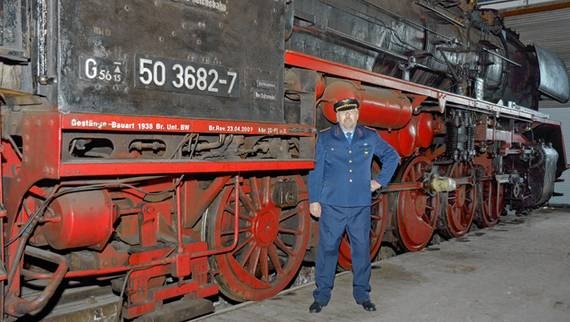 Stadtführer Jürgen Schmidt vor der Dampflok von 1939, die ebenfalls zum Vereinsbestand gehört. Neben den Veranstaltungen, die die Dampflokfreunde anbieten, gibt es auch spezielle Angebote des Kultur- und Tourismusbetriebes. Schmidt führt als Eisenbahner ins Depot. |