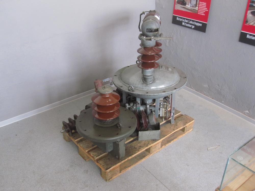Außerdem ist der Hauptschalter einer Elektrolok der Baureihe 109 ausgestellt. Er dient dazu, die Lokomotive elektrisch vom Stromfluss aus der Oberleitung zu trennen. Das Bauteil ist recht groß dimensioniert, weil es zuverlässig eine Spannung von 15.000 Volt unterbrechen muss.