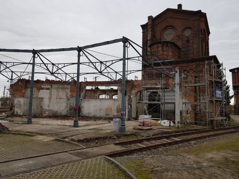 Und zum Schluss noch zu den Arbeiten am Lokschuppen I. Endlich wurde das Baugerüst aufgestellt, durch welches das Arbeiten an der Mauerkrone möglich wird. Da dort von oben Wasser eingedrungen ist, müssen die obersten Lagen entfernt und neu aufgemauert werden. Das wird zeitnah durch eine Fachfirma erledigt. Danach kommen die Dachdecker.