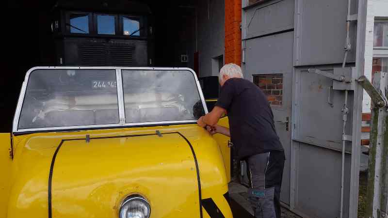 Eine kleine Reparatur musste auch die Trabant-Draisine über sich ergehen lassen. Beim letzten Einsatz war die Windschutzscheibe beschädigt worden und musste ausgetauscht werden. Zum Glück konnten neue Scheiben aus Sicherheitsglas beschafft und eingebaut werden.