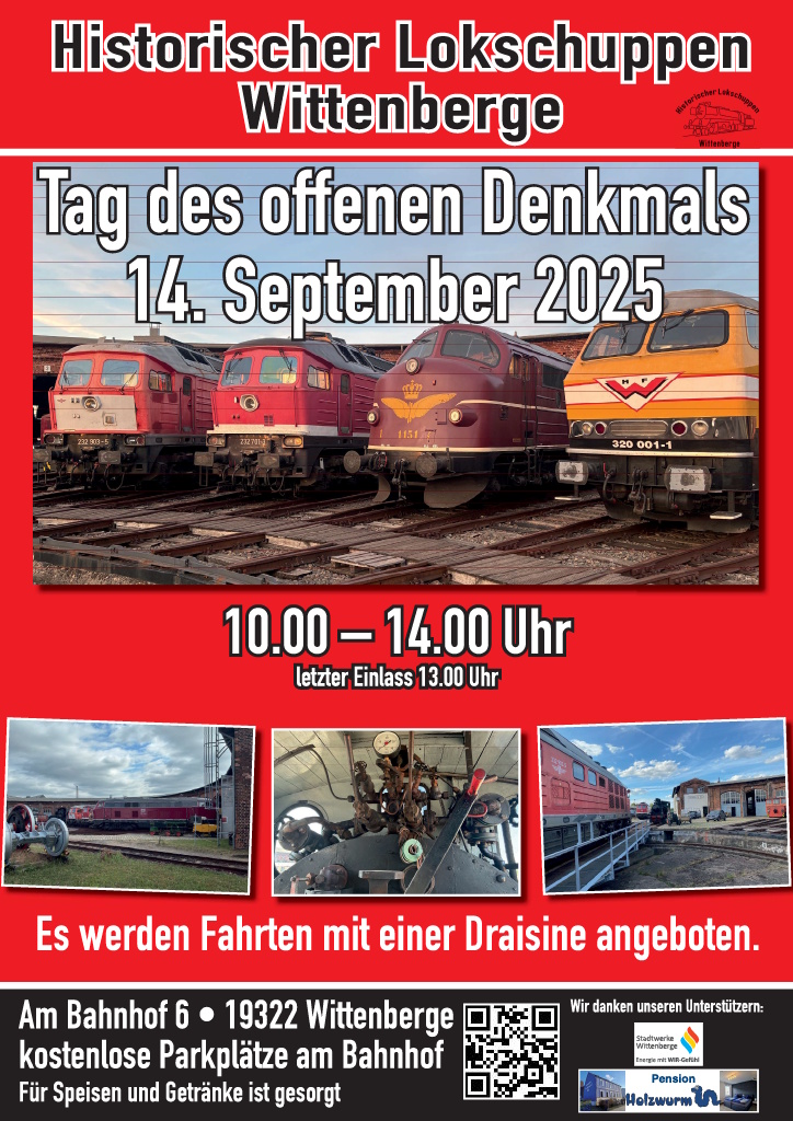 Wir freuen uns, Sie heute auf einige Veranstaltungen im September hinweisen zu dürfen. Der Tag des offenen Denkmals findet 2025 am Sonntag, 14. September, statt, und das Motto lautet: "Wert-voll: unbezahlbar oder unersetzlich". In Brandenburg werden wie in ganz Deutschland historische Gebäude und Anlagen für die Öffentlichkeit zugänglich gemacht. Wir schließen uns dieser Initiative gerne an und öffnen unser Museum außerplanmäßig auch an diesem Sonntag zwischen 10 und 14 Uhr. Das besondere an diesem Tag ist, dass der sonst übliche Eintrittspreis entfällt und Sie unser Museum kostenlos besuchen können. Wir freuen uns natürlich über Spenden, weil der Betrieb des Museums auch an diesem Tag Geld kostet.
