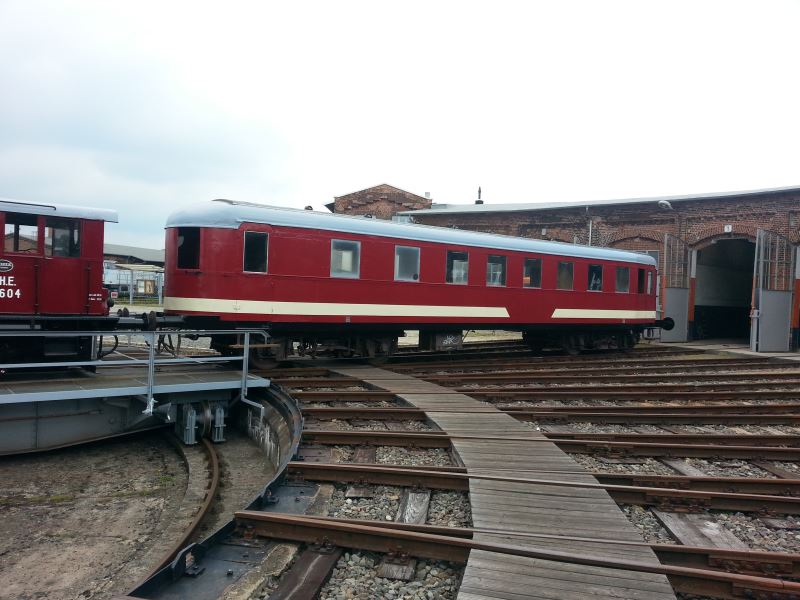 Nachdem nun der Hallenstand frei wurde, werden wir uns des Autotransportwagens aus dem Regierungszug von Walter Ulbricht annehmen. Dabei handelte es sich ursprünglich um einen vierachsigen Packwagen, der 1961 als Transporter für maximal zwei Kfz umgestaltet wurde. Dafür erhielt er größere Seitenschiebetüren und die Stirnwände wurden als Einfahrtstore ausgelegt. Außerdem wurde das Fahrzeug im Bereich des Wagenbodens verstärkt, denn auch die damaligen Staatskarossen hatten bereits ein hohes Gewicht. Wenn Sie, liebe Leser, durch Zufall zu diesem Fahrzeug noch Bilder oder sonstige Dokumentation haben, würden wir uns über Kopien sehr freuen.