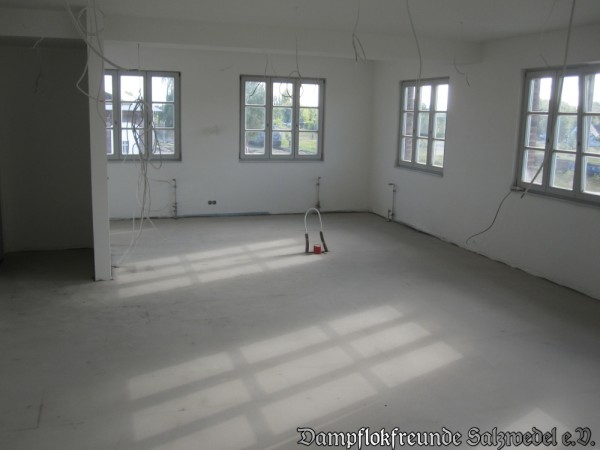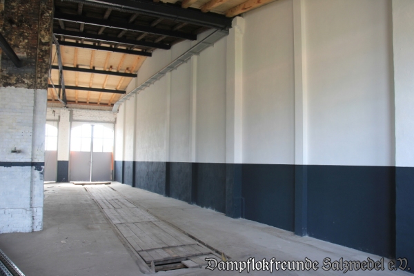Nachdem sämtliche Tore und Zugänge zum Lokschuppen nun verschließbar sind, wird der Innenausbau vorangetrieben. So werden derzeit sämtliche Versorgungsleitungen für Strom, Wasser, Druckluft und Heizung neu verlegt. Der Putz im Lokschuppen ist fertiggestellt. Der Sockel der Wände wird industrieüblich jeweils schwarz gestrichen.