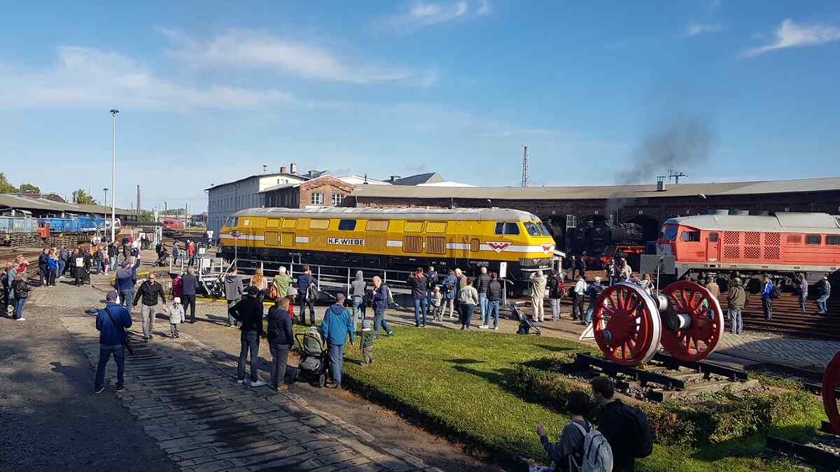 Was ist sonst noch geschehen? Wir hatten am vergangenen Wochenende drei Veranstaltungen zu absolvieren und das war nicht nur aufgrund des sommerlichen Wetters ziemlich anstrengend. Am 9.9. öffneten unsere Nachbarn, die Schienenfahrzeugwerke Wittenberge, ihre Tore für Interessierte. Dabei haben wir natürlich unterstützt, weil wir uns ja eigentlich das Gelände des ehemaligen Bahnbetriebswerkes Wittenberge teilen. Wir denken auch, dass wir uns gut ergänzt haben, denn die SfW zeigten moderne Technik, wir dagegen die historische.
